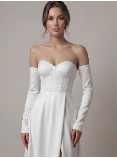 Obleko dopolnjujejo snemljivi rokavi, ki ustvarijo romantičen videz, po želji pa je mogoče dodati tudi nežne špageti naramnice za dodatno oporo in drugačen slog. Popolna izbira za neveste, ki želijo združiti eleganco, sodoben videz za ugodno ceno.