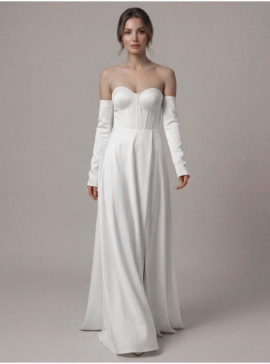 Elegantna satenasta poročna obleka očara s poudarjenim životcem v srčasti obliki, ki lepo oblikuje dekolte in poudari ženstveno silhueto. Padajoče krilo iz mehkega satena ima razporek, ki omogoča svobodno gibanje.