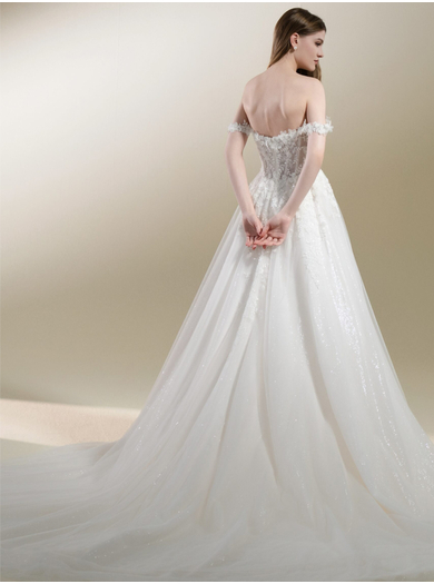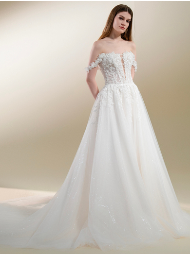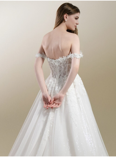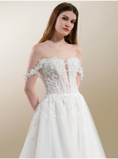 Romantična poročna obleka s spuščenimi naramnicami očara z razkošno čipko in nežno posutimi kristalčki, ki dodajo pridih pravljičnega blišča. Večslojno krilo iz rahlo svetleče tkanine se čudovito giblje in zažari ob vsakem koraku, kar ustvarja očarljiv videz, popoln za nepozaben poročni dan.