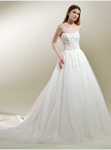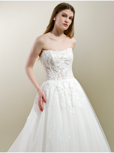 Romantična poročna obleka z modno oblikovanim životcem je popolna izbira za neveste, ki prisegajo na zaprt dekolte. Ta očara z nežno čipko in drobnimi kristalčki, ki ustvarjajo pridih prefinjenega blišča. Razkošno večslojno krilo iz rahlo svetleče tkanine poskrbi za čaroben lesk pri vsakem koraku in zagotavlja pravljično silhueto, ki bo zasijala v vsakem trenutku vašega posebnega dne.