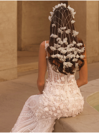 Za popoln zaključek stajlinga poskrbi unikaten dodatek za lase, okrašen z ujemajočimi cvetnimi aplikacijami, ki se čudovito skladajo s čipko obleke in ustvarjajo celosten, harmoničen videz..