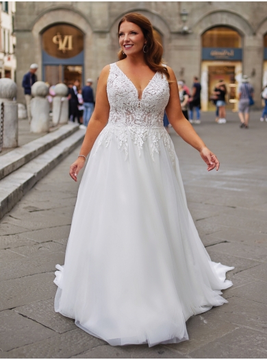 Čudovita A-linijska poročna obleka za plus size neveste. Moden čipkast životec z zapeljivim V-izrezom, okrašenim s cvetličnimi vezeninami, se nežno prelije v romantično krilo. Obleka, ki združuje brezčasen slog in brezskrbno eleganco.