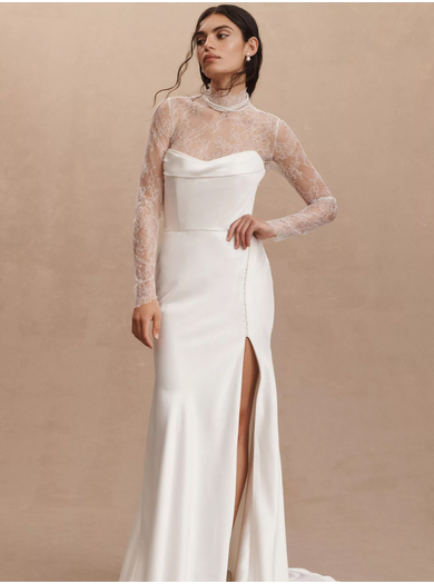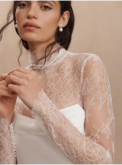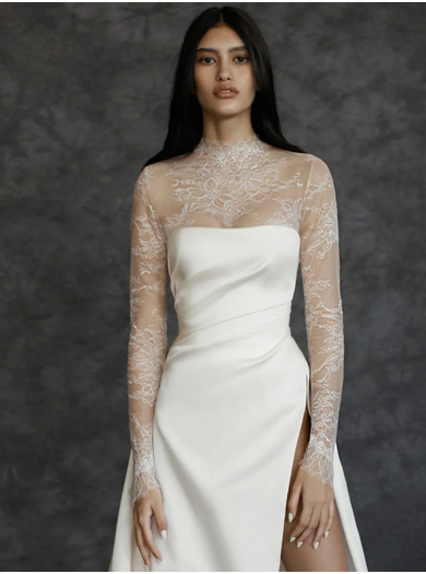 Elegantni top s čipkastim visokim ovratnikom in dolgimi rokavi je popolna izbira za neveste, ki si želijo prefinjen in razkošen videz. Kombinirate ga lahko kot podlaga preprostejšim oblekam različnih krojev. Zapira se zadaj, na tilniku s prefinjenimi prosojnimi gumbi.