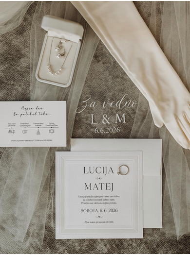 Elegantna poročna vabila v prefinjenih belih in kremnih odtenkih očarajo s svojo brezčasno eleganco. Osrednji kartonček, namenjen vašemu besedilu, krasijo čudoviti reliefni robovi, ki dodajo poseben, prestižen pridih.