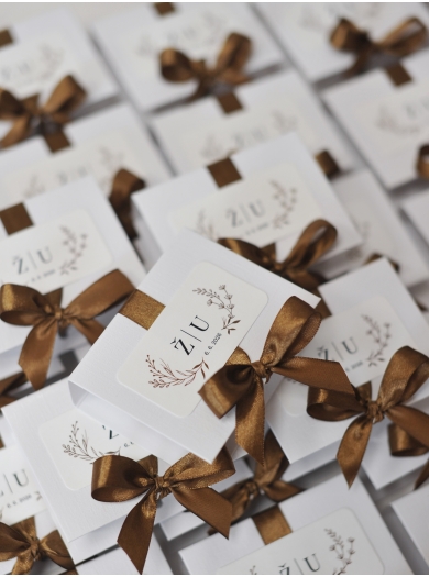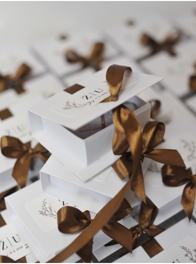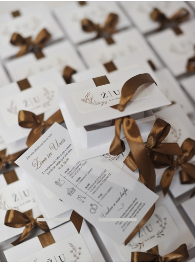 Unikatno poročno vabilo, primerno za vse stile porok. Vabilo je sestavljeno iz škatlice - knjige, v notranjosti je zvitek iz paus papirja, kamor se natisne vajino besedilo. Vabilo krasi saten trak in personaliziran kartonček z imeni mladoporočencev.
