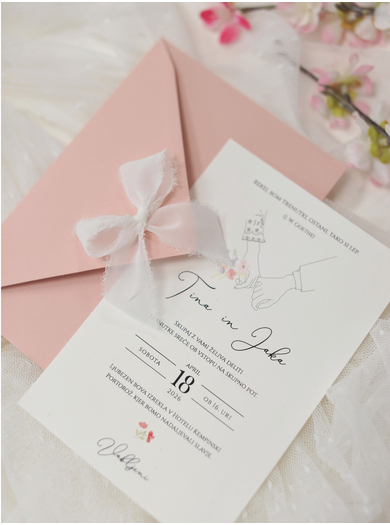Elegantna in minimalistična poročna vabila z motivom prepletenih dlani, ki simbolizirajo povezanost in ljubezen. Vsako vabilo je dopolnjeno s pastelno roza kuverto, ki doda pridih nežnosti. Besedilo oblikujemo po vaših željah – brez dodatnih stroškov. Za popoln zaključek videza lahko ovojnico okrasite s pentljo po lastni izbiri (doplačilo).
