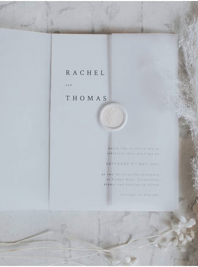 Poročna vabila v minimalističnem slogu združujejo eleganco in preprostost. Vabilo je sestavljeno iz prosojnega ovoja in kartončka, na katerem je natisnjeno vaše besedilo, dopolnjuje pa ga bel pečat z motivom evkaliptusove vejice. Vsako vabilo vsebuje tudi usklajeno ovojnico.