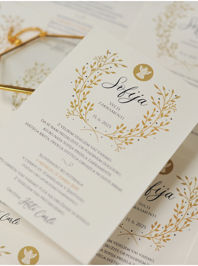 Moderna vabila za sveti krst. Grafika vejic z angelom in besedilo je natisnjeno na bel mat karton, 250 gr. Kuverta je vključena v ceno vabil.