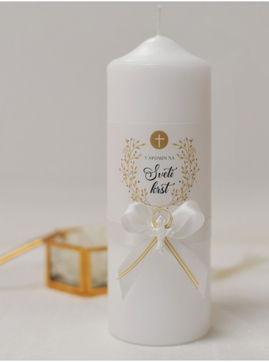 Eleganten spomin na sveti krst vašega malčka. Sveča je okrašena s prefinjenim grafičnim motivom in napisom, dopolnjena s trakom, pentljo ter keramično figurico belega križa, ki simbolizira čistost in duhovno varnost. Popolna kot darilo ali trajen spominek na poseben dan.