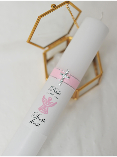 Sveča za sveti krst s potiskom. Na krstni sveči je ovoj, na katerem je natisnjen motiv angela ter dekoracija iz satenastega traku s figuro križa. Sveča je personalizirana, možno spreminjanje barce (na voljo tudi za dečka).