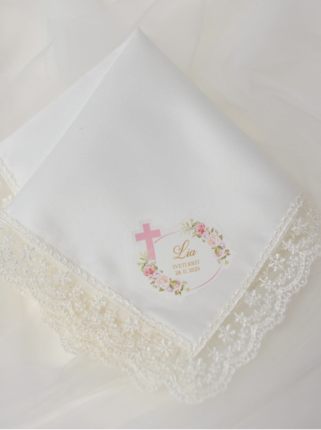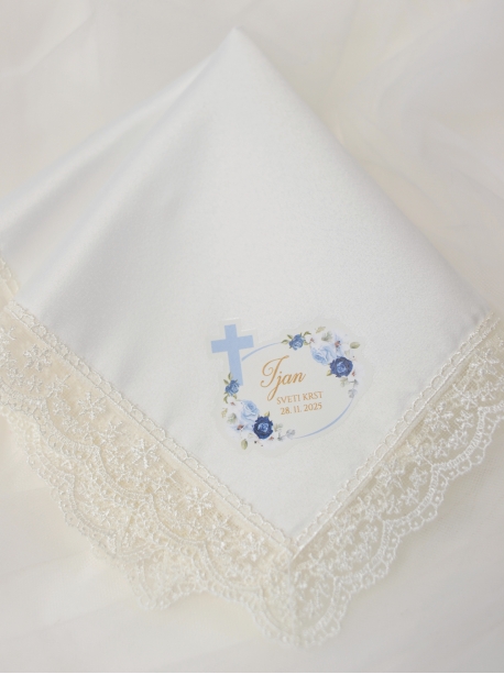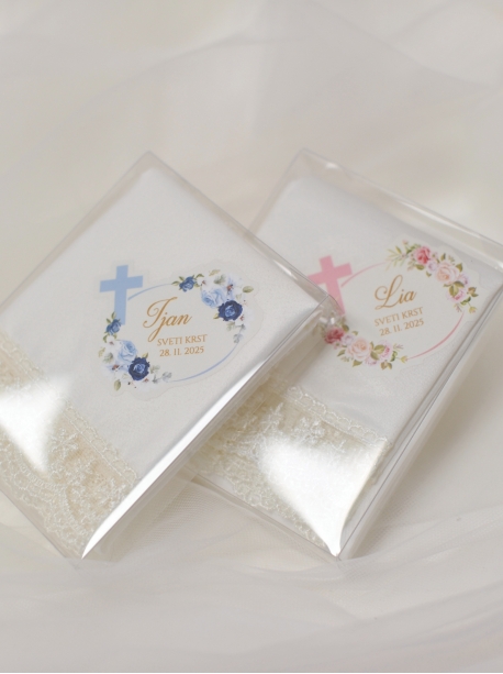 Ob prejemu svetega krsta ne sme manjkati belo krstno »oblačilo« v obliki prikupnih prtičkov, ki jih za vas personaliziramo. Krstne prtičke lahko barvno prilagodimo vašim željam, lahko pa jih uskladimo tudi s krstnimi svečami. Pred izdelavo vam pošljemo osnutek v pregled in potrditev v PDF obliki.